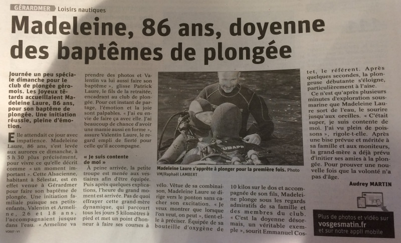Dimanche dernier, Madeleine 86 ans, la maman de Patrick, est venue pour faire son tout 1er baptême de plongée.